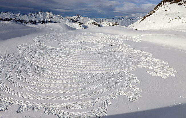 One hundred and fifty snow drawings later, quite a few things have changed. Where he was once restricted to scouting locations and photographing his work from mountain tops and ski lifts, he can now afford to work out of an aircraft if he chooses; instead of winter boots, he now wears snowshoes. His work has gone from a fairly solitary pleasure to something enjoyed by thousands online.